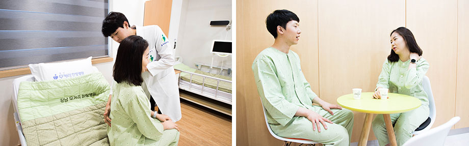 모커리한방병원 강남점·의정부점은 교통사고 환자들의 1:1 맞춤 입원집중치료를 위해 쾌적하고 넓은 입원실이 마련되어 있습니다. 특히 강남점은 총 92개의 병상으로, 환자분들이 보다 편안한 환경에서 쾌적하게 치료를 받으실 수 있도록 전 병실이 4인실 이하로 구성되어 있습니다. 또한 환자분들의 편의를 제공하기 위해 병상 간의 간격도 최대로 넓혔으며, 각 침대마다 개인 모니터와 조명이 마련되어 있습니다.