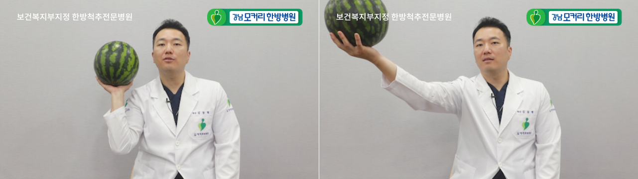 이 수박을 드는 것을 거북목에 비유하자면 수박이 머리고, 팔이 목인 것입니다.