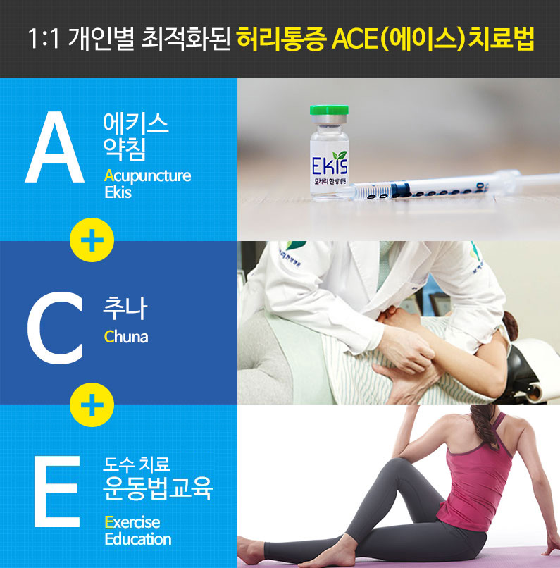 위에서 설명한 에키스 약침(Acupuncture of Herbal Medicine)과 이완추나(Chuna), 도수치료및 운동법 교육(Exercise Education)을 통합하여 허리통증 ACE(에이스) 치료법이라고 합니다. 이러한 ACE 치료법은 허리통증 치료에 효능이 있는 여러 치료법을 복합적으로 진행함으로써 치료 효과를 배가시킬 수 있습니다.