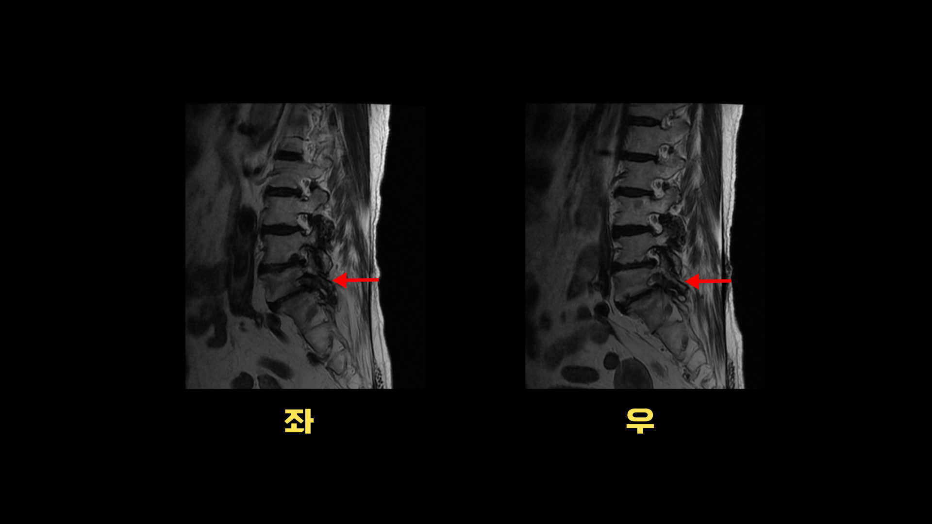 이분 MRI를 보면 퇴행성디스크가 여러 마디가 있고 그 중에서도 특히 5번 1번에는