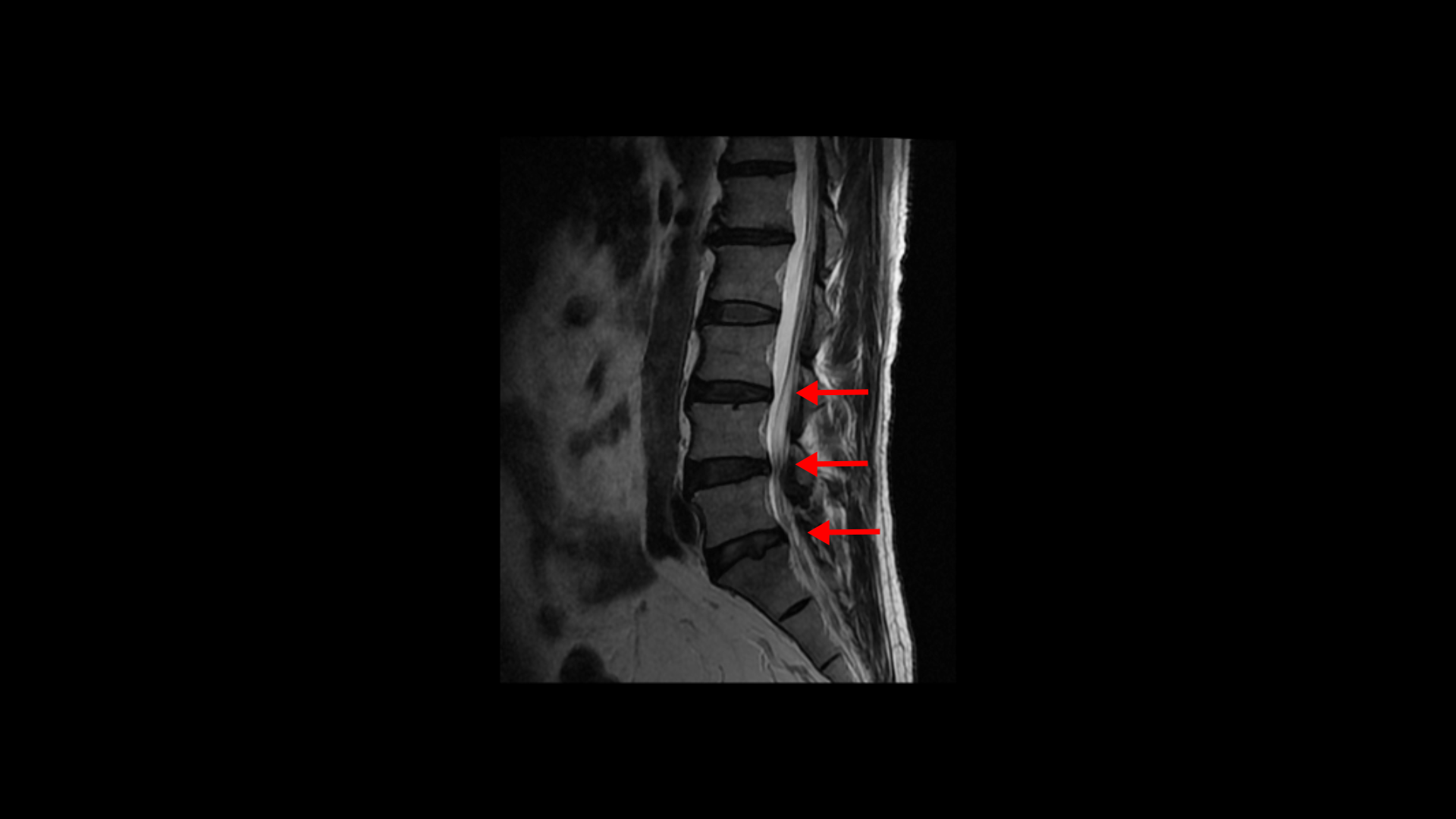 특히 MRI에서 보이는 신경 눌림이 심하지 않을수록 근육 문제일 가능성은 훨씬 더 높아집니다. 이 환자분 MRI를 한번 볼까요? 세 마디에 퇴행성 디스크가 있지만 심하지 않습니다.
