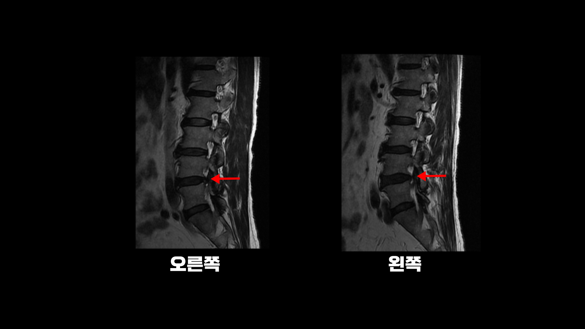 이렇게 신경 구멍 좁아짐이 심하지 않으면 근육 문제일 가능성은 훨씬 높아집니다. 그리고 신경 구멍이 많이 좁아져 신경 눌림이 심해 보인다고 하더라도 역시 어느 날 갑자기 한쪽 다리, 엉덩이가 아픈 증상은 근육 문제가 가장 중요한 원인입니다.