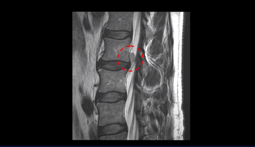 우선 이분 MRI를 보면 디스크가 심하게 터져 위로 밀려 올라가 있습니다. 신경가지가 나가는 구멍을 보시다시피 막고 있으니까 마비 증상과 방사통이 있습니다.