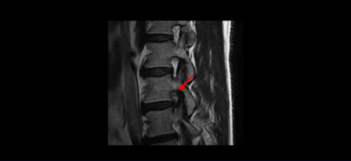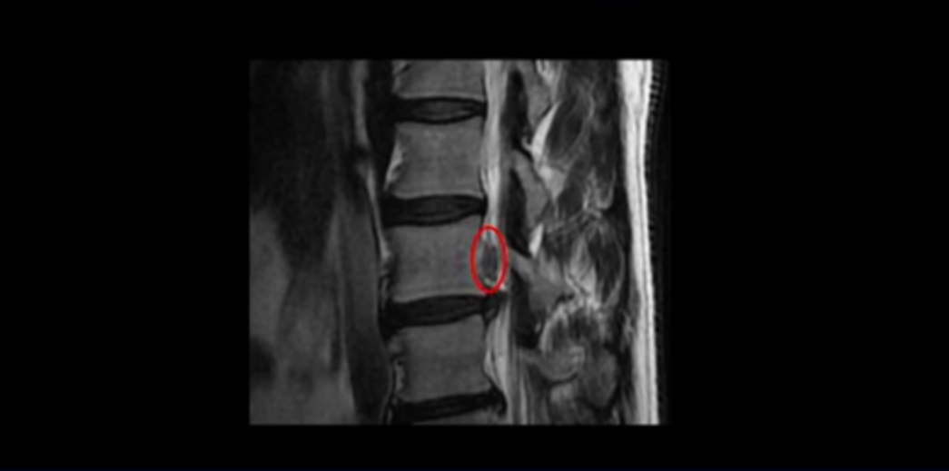 이 환자분 말씀 잘 들으셨습니까? 이분 MRI를 보면 3번과 4번 디스크가 심하게 파열되어 밀려나온 수핵이 위로 밀려 올라가 있습니다. 수핵이 위로 밀려 올라가면서 디스크 본체와의 연결이 끊어져 있습니다.