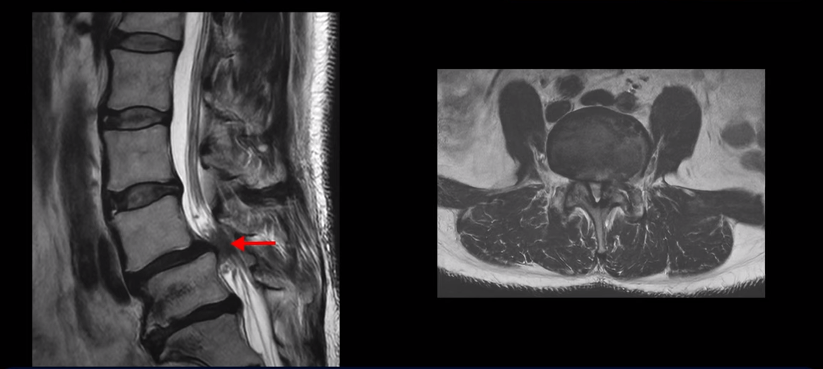 이건 아주 오래된 퇴행성디스크로 보입니다. 그래서 이 환자분은 양쪽 엉덩이와 다리가 모두 저리고 아픈 게 양쪽 추간공 문제 때문일 수도 있고 중심성 협착 때문일 수도 있습니다. 퇴행성디스크 때문에 아플 가능성은 상대적으로 적어보입니다.