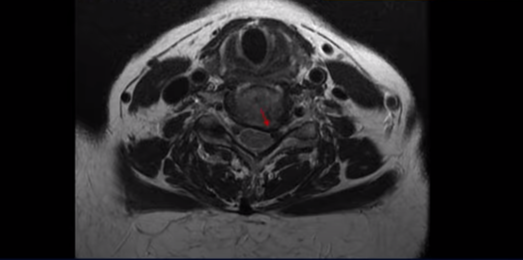 우선 이분 MRI를 보면 목디스크 6번 7번에 오른쪽으로 디스크가 터져서 밀려 나와 있습니다. 이 문제가 오른쪽 팔 통증과 견갑골 통증을 일으키는 걸로 보입니다.