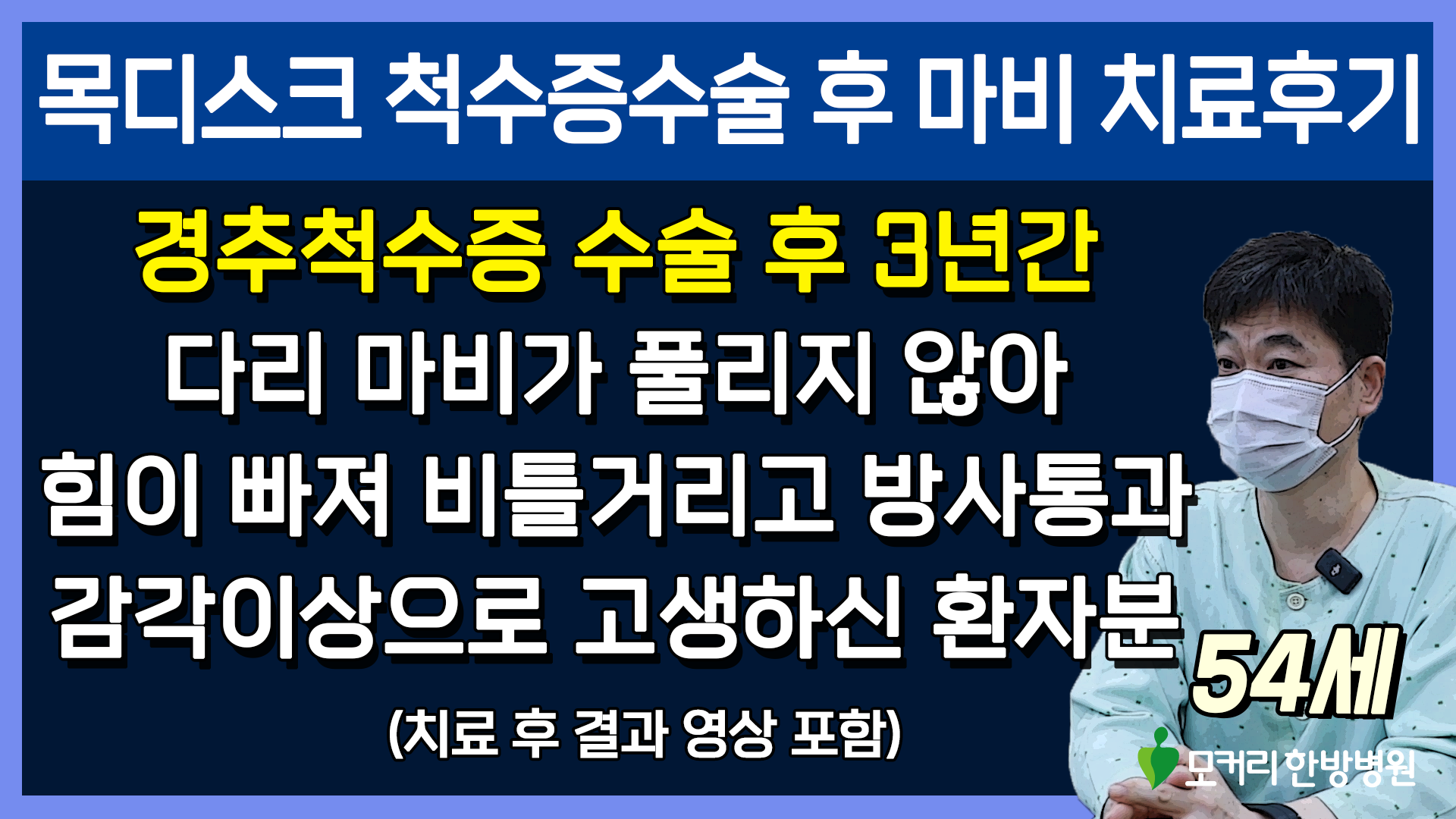 수술 후에도 풀리지 않는 마비증상을 수술 병원의 설명대로 마냥 신경 기능이 회복될 때까지 기다리는 것만이 정답이 아닙니다. 이분의 치료 결과를 보시고 수술 후에도 마비가 빨리 풀리지 않는다면 적극적인 근육신경재활치료가 필요합니다. 아직 수술 받지 않은 마비 환자분들은 수술 받지 않은 상태로 근육신경재활치료를 받으시면 됩니다. 제일 중요한 것은 마비는 치료 시작이 빠르면 빠를수록 좋다는 겁니다. 이분의 치료 후 결과가 궁금하시다면 아래 영상을 꼭 보시길 바랍니다.