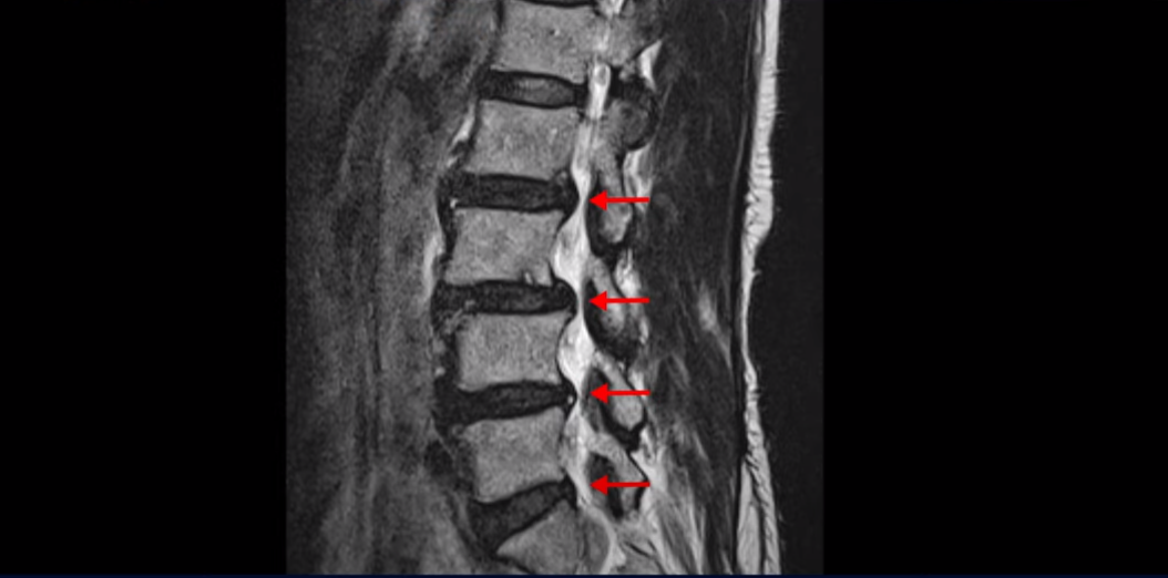 이분 허리를 보면 여러 마디의 퇴행성 디스크와 협착이 있습니다.