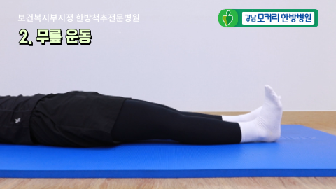 한쪽 무릎을 구부렸다 펴는 이 동작을 10-20회 정도 반복한 뒤, 운동한 쪽의 다리를 바닥에 편안하게 내려놓고 반대쪽 다리도 똑같이 해주시면 됩니다. 이 무릎 운동을 하실 때 꼭 기억하셔야 할 것은 두 다리를 동시에 들어올리면 허리에 부담이 되기 때문에 반드시 한쪽 다리씩 따로따로 운동하셔야 합니다.